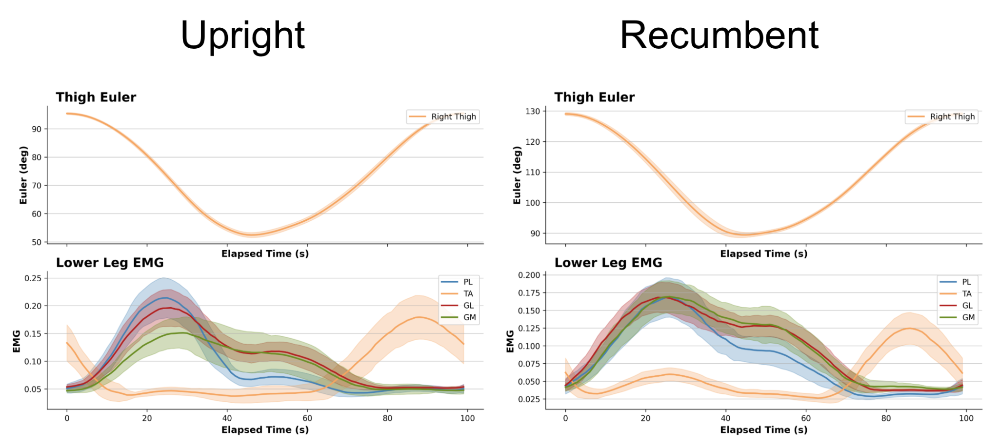 Recording of lower leg EMG vs. thigh angle in upright and recumbent cycling